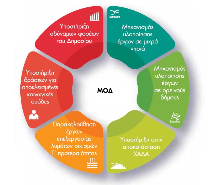 Η ΜΟΔ παρέχει μέσω Ειδικών Ομάδων συμβουλευτική και τεχνική στήριξη σε φορείς υλοποίησης αναπτυξιακών έργων και δράσεων, με στόχο τη βελτίωση της διοικητικής και διαχειριστικής τους ικανότητας, την ωρίμανση / υποβολή προτάσεων για ένταξη έργων σε τομεακά και περιφερειακά προγράμματα, καθώς και την υλοποίησή τους.
